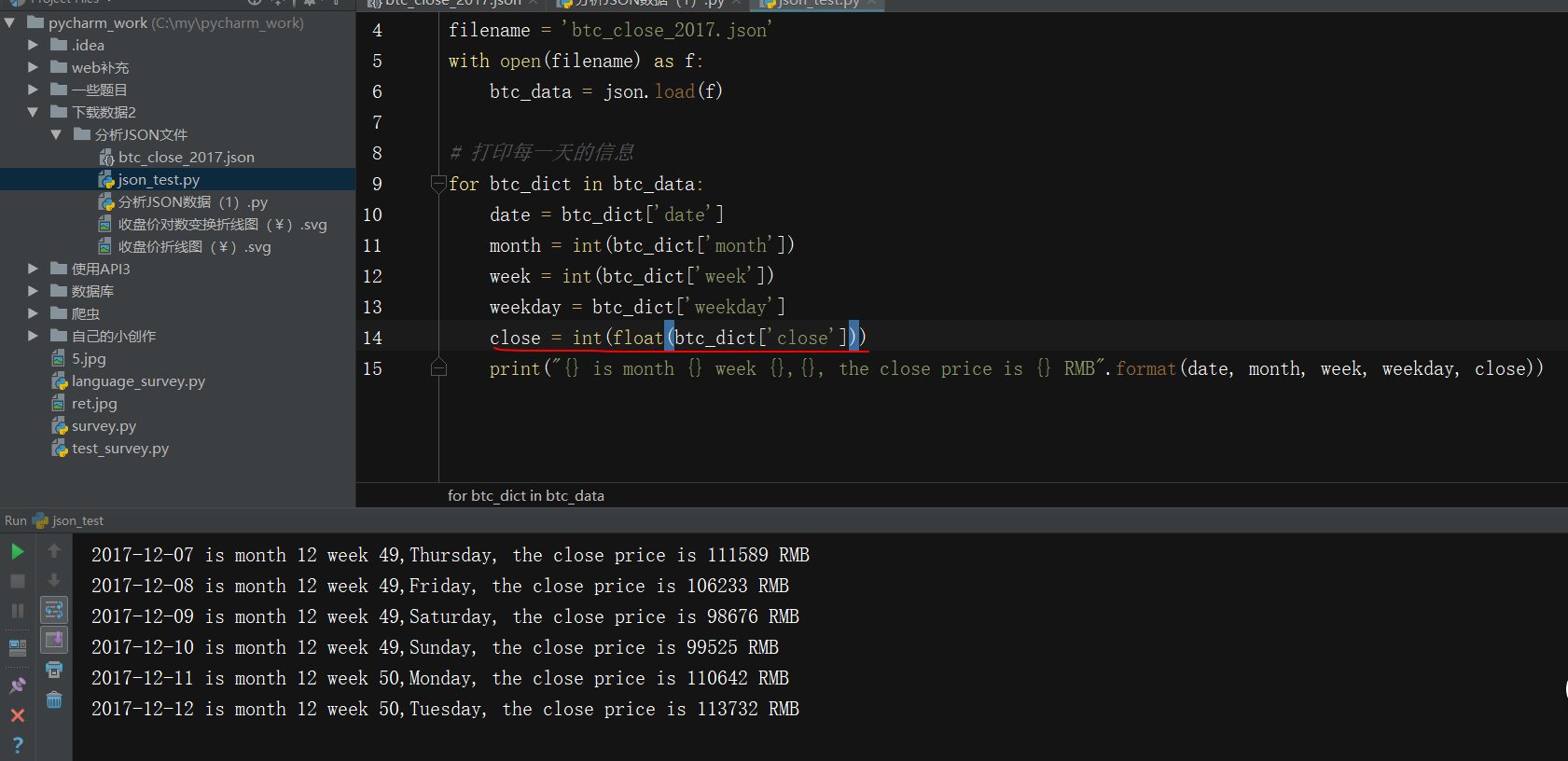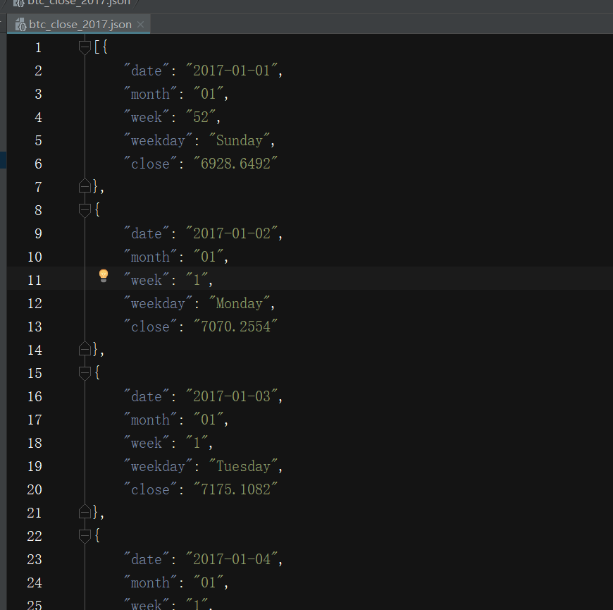 观察文件可知:此文件实际上就是一个很长的python列表,其中每个元素都是一个包含五个键的字典:统计日期,月份,周数,周几及收盘价。