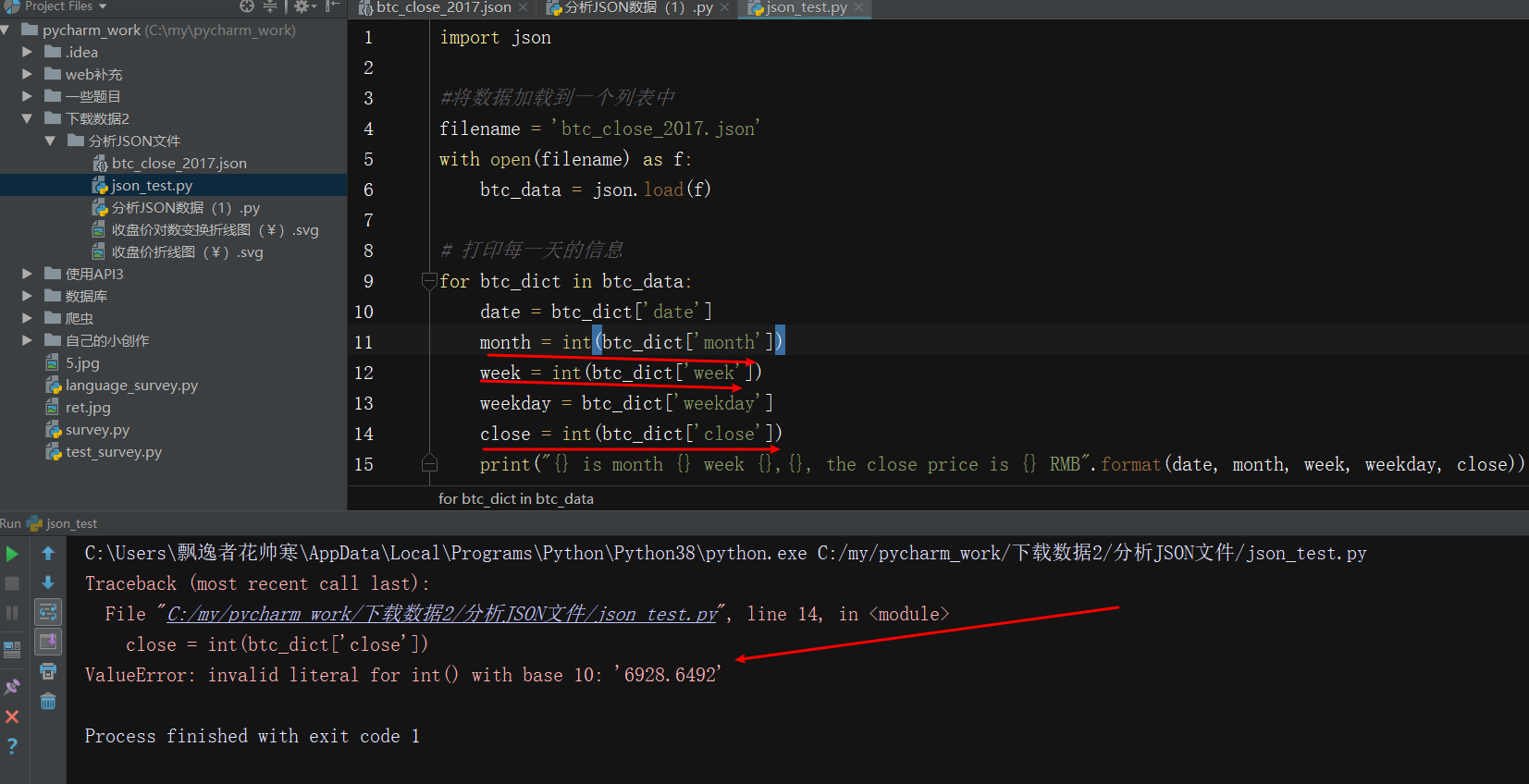 但是将收盘价close转换为整数时,出现了ValueError异常。原因:python不能直接将包含小数点的字符串“6928.6492”转换为整数。解决方法:先将字符串转换为浮点数,再将浮点数转换为整数: