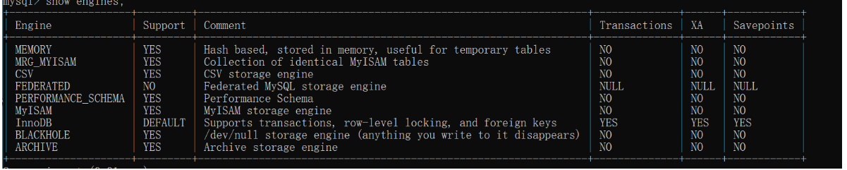 默认存储引擎是InnoDB ,在mysql5.5之后,默认使用InnoDB,mysql5.5之前使用MyIasm,支持的所有引擎,只有InnodDB是支持事务的