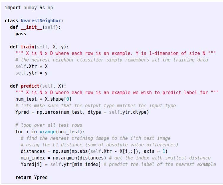 - K最近邻居分类器基于最近的训练示例预测标签距离度量和K是超参数。使用验证集选择超参数;最后只在测试集上运行一次!