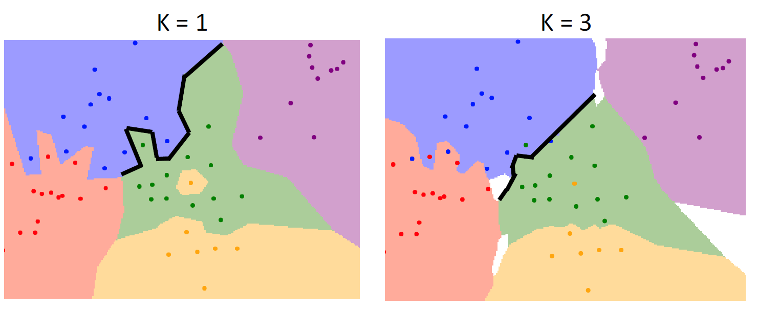 当我们使用k=3时,我们有了更加平滑的分界线,也有了更加健壮的处理outlier的情况。