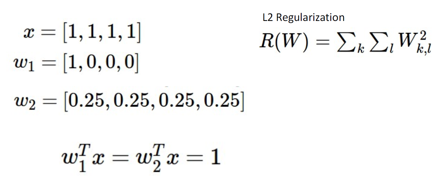 对于w1和w2,他们的训练结果都是一样的,但是对于L2正则函数而言,他们会更喜欢均匀分布的权重,即w2。