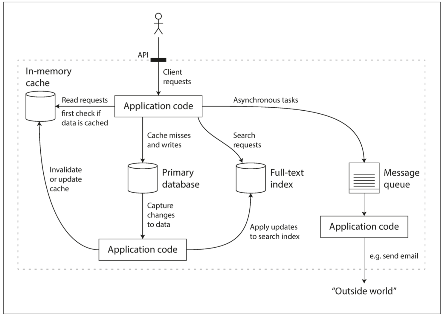 当你将多个工具组合在一起提供服务时,服务的接口或应用程序编程接口(API, Application Programming Interface) 通常向客户端隐藏这些实现细节。现在,你基本上已经使用一个个小的通用组件创建了一个全新的、专用的数据系统。这个新的复合数据系统可能会提供特定的保证,例如:缓存在写入时会作废或更新,以便外部客户端获取一致的结果。现在你不仅是应用程序开发人员,还是数据系统设计人员了。