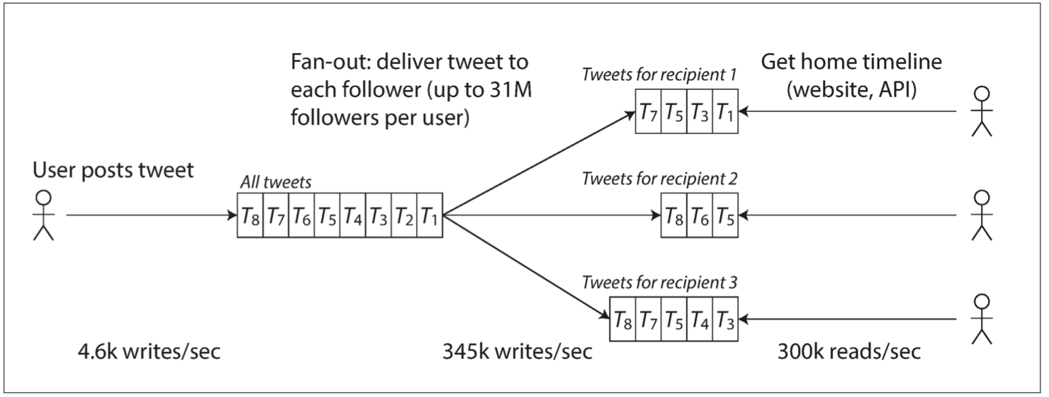 处理每秒12,000次写入(发推文的速率峰值)还是很简单的。然而推特的伸缩性挑战并不是主要来自推特量,而是来自扇出(fan-out)2——每个用户关注了很多人,也被很多人关注。