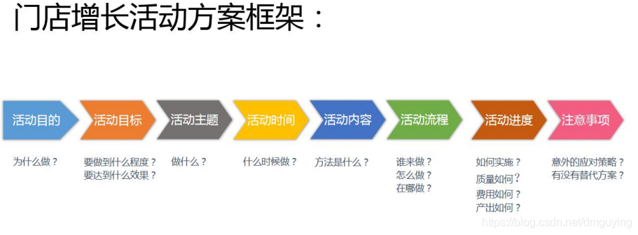 要做一件事,首先需要思考我们的初衷。从商家的角度:我为什么做这次活动,也就是①【活动的目的】,是新店为了拉新?还是已经有老客,为了促活、锁客、复购…也有可能是品牌店想要宣传,做一次节点促销等等。有了目的要量化成②【活动目标】,选择活动目标人群,设定目标值,让自己知道该往哪对谁努力,努力到什么程度。再根据活动目的、目标人群和商业节点设置③【活动主题】;根据门店、商业节点选定④【活动时间】,例如即将到来的“五一”,是一个热门的促销活动好节点。有了主要思路,进一步展开⑤【活动内容】:活动的玩法(包括参与人、福利、规则、流程等),其中⑥【活动流程】商家需要了解整体活动流程、线上线下怎么推广。再细化要做的事情⑦【活动进度】在哪个时间完成。最后,为确保活动周全,⑧【活动