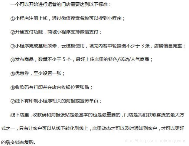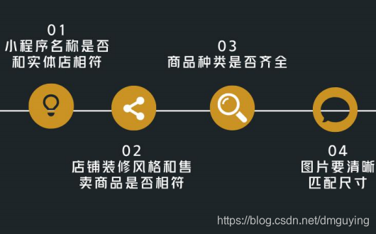 小程序名称是否和实体店相符、店铺装修风格和售卖商品是否相符、商品种类是否齐全商品展示和商品详情描述是否充实、活动商品选择的是否合适、营销功能设置的是否合理店铺维护情况。