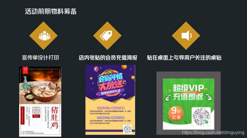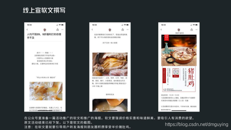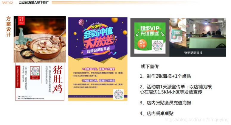 ②推送场景:针对线上的转发场景制作朋友圈推广海报+文案、线下实体店宣传场景设计宣传单和门头的抽奖活动、店里方便客户下单的桌贴等等。