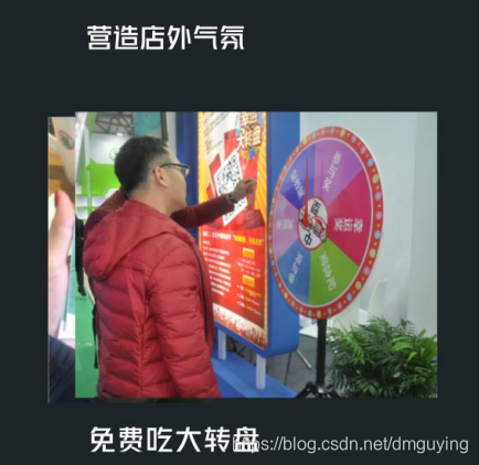 活动前,店铺门前广场游戏道具,如免费吃大转盘,由客户转动转盘提供当日菜品,用户有机会获得一个免费菜;如果带小朋友的客户可以先领气球再转动转盘。