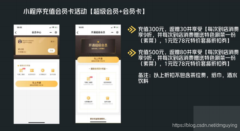 ①小程序通过轮播图、活动商品第一屏展示、会员充值指示等店铺装修引导客户参与活动。