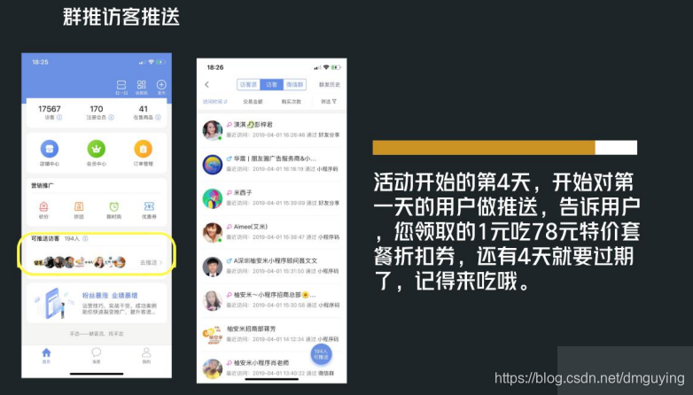 小程序群推访客要用起来,活动开始的第 4 天,开始对第一天的用户做推送,然后依次类推。告诉用户,您领取的 1 元吃 78 元特价套餐折扣券,还有 4 天就要过期了,记得来吃哦。
