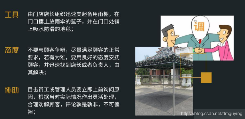 ①由门店店长组织迅速支起备用雨棚,在门口摆上放雨伞的篮子,并在门口处铺上吸水防滑的地毯;