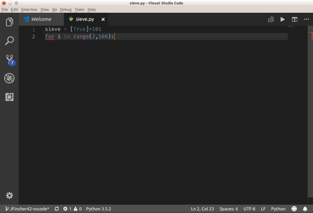 若要激活 Python 扩展,请保存文件(从菜单中选择 File-Save 或者从命令面板中选择 File-Save File 或者只使用 Ctrl + S)为 sieve.py。VS Code 将看到.py 扩展名并正确地将该文件转化为 Python 代码。