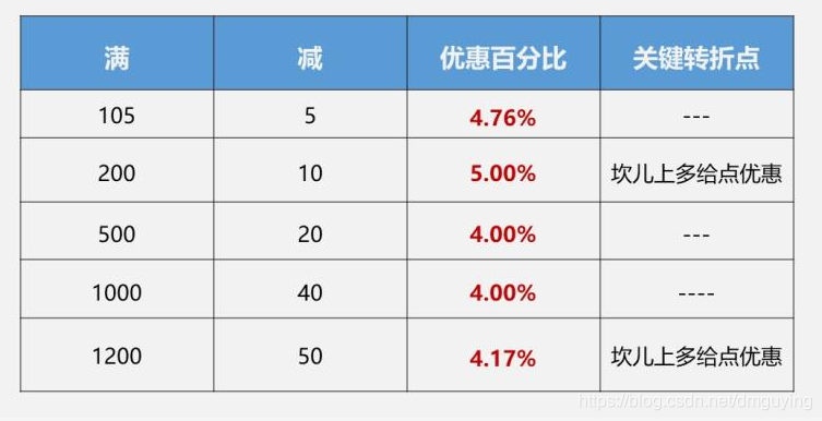 计算一下优惠百分比,你会发现有一个有意思的现象:整体上,【用户消费额度越大,优惠金额也越大】,但是百分比在减小的,只有在某些关键的坎儿上会猛提百分比。