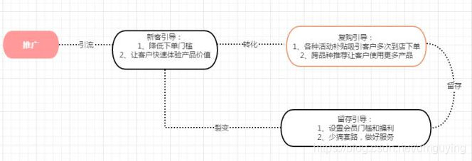 客流,可能是新客也可能是老客回顾(复购),而新客首次购买=自来新客(引流)+老客介绍来的新客(裂变)。