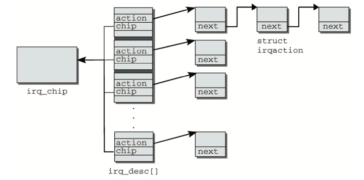 这里大家肯定会有疑问,中断号是怎么共享的呢?实际上每个中断号对应一个中断处理程序只是一个笼统的说法,当多个设备共用同一个中断号时,显然一个中断号会对应一组处理程序。实际上,在我们安装设备的驱动时,就会将该设备对应的中断处理程序注册到对应的中断号上,换句话说,内核会为每个中断号,维护一个处理程序链表(下图 action),链表上的每个节点都对应了一个使用该中断号的设备。
