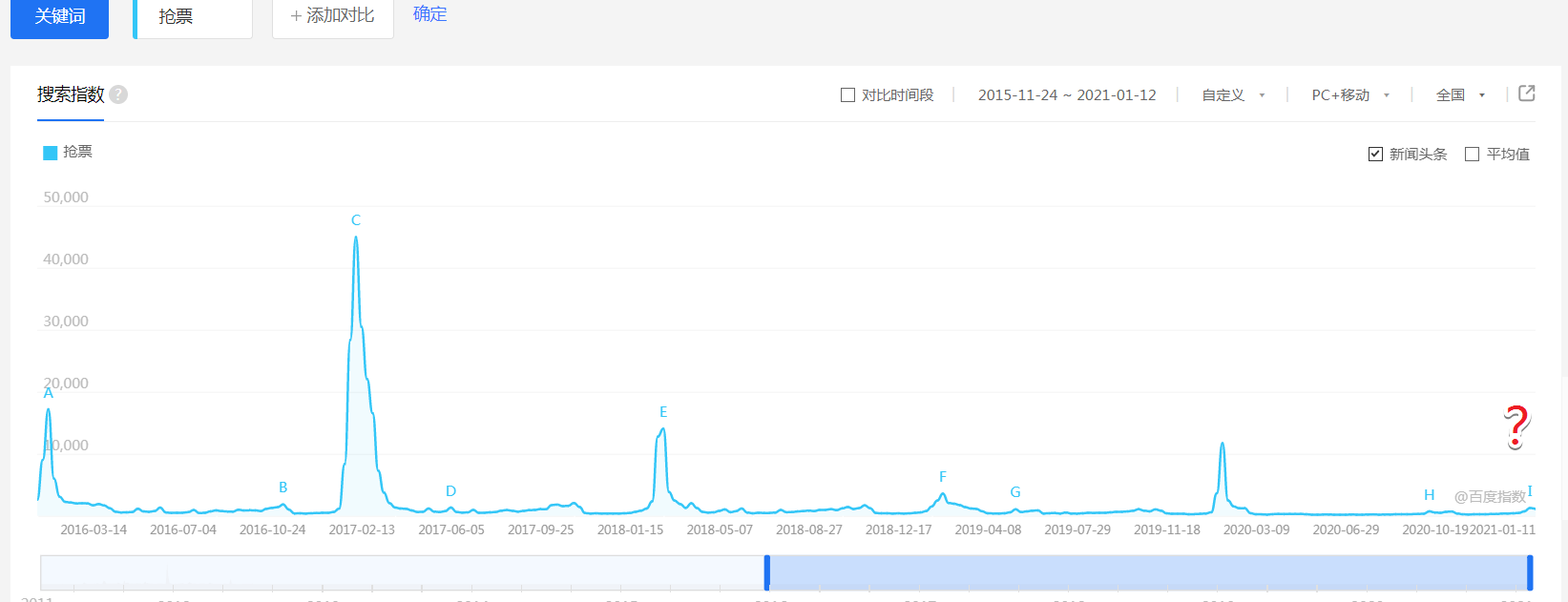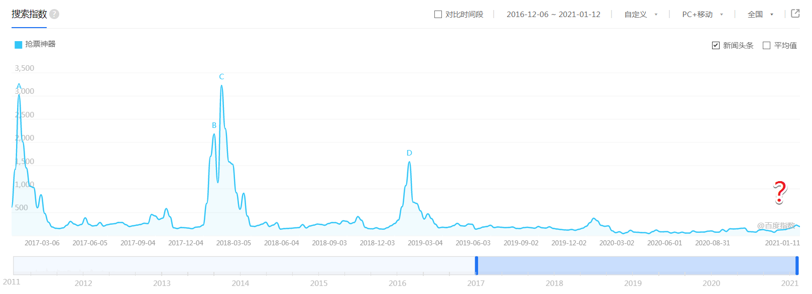 打开百度指数,检索抢票神器,在 2021 年元旦,可怜的抢票神器,搜索都平了…,变的无人问津。