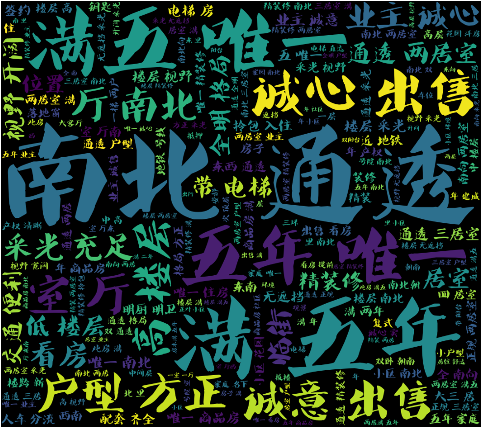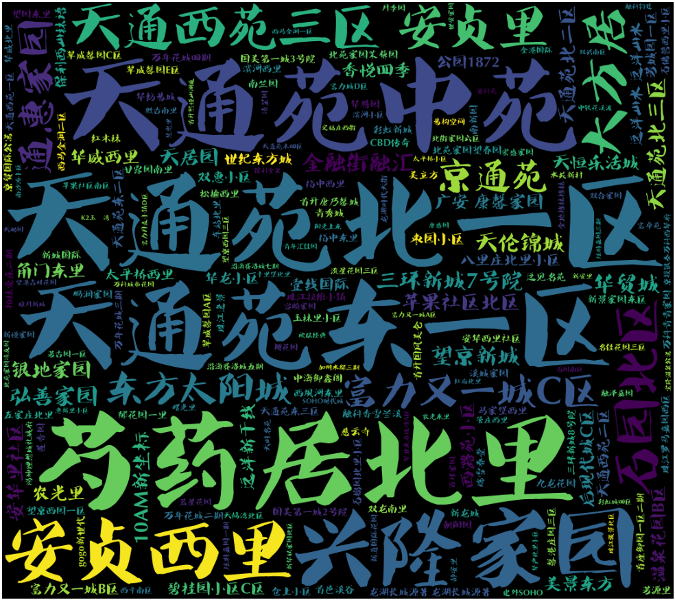 这块词云其实就是小区名称房源数的多少决定的,天通苑、芍药居、兴隆家园的房子二手房源真的多啊!!