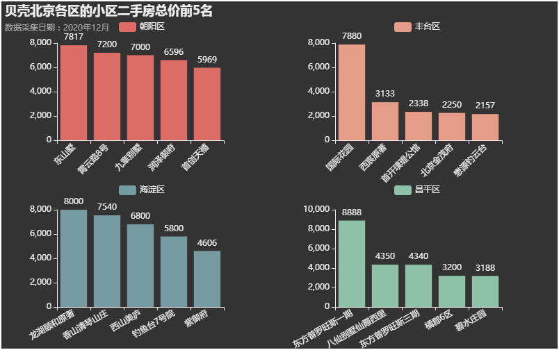 北京房源数最多的四个区域总价均值最高的小区分别都是谁呢?