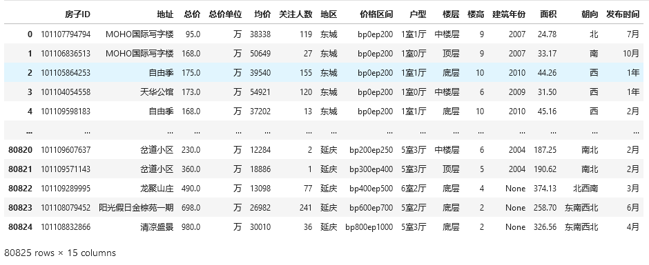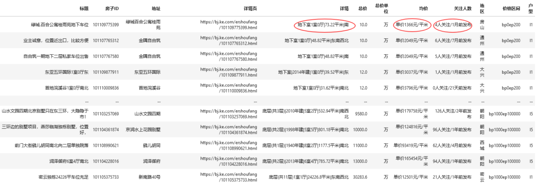 我们可以看到,在原始数据中 详情包含的信息较多,比如楼层、户型、面积、建筑年份和朝向等等,对于地下室和底层的部分大多数都是车位,索性就不考虑这部分数据,这部分我们后续进行清洗。同时,在均价和关注人数中也都包含更多信息需要我们解析出来。