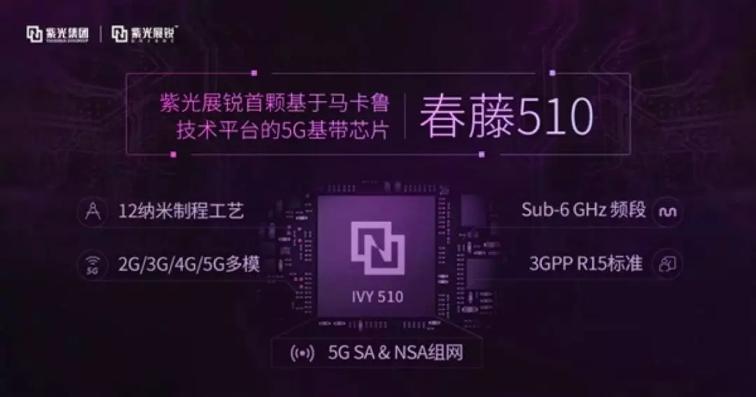 得益于展讯和锐迪科在射频领域的长期积累,展讯在5G元年就推出了基于台积电12nm的5G基带芯片紫光春藤510,尽管性能无法与高通、华为等大厂相提并论,但是也支持多项5G关键技术,单芯片统一支持2G/3G/4G/5G多种通讯模式,符合最新的3GPP R15标准规范,支持Sub-6GHz频段、100MHz带宽,是一款高集成、高性能、低功耗的5G基带芯片。同时支持5G SA独立组网、NSA非独立组网两种组网方式。