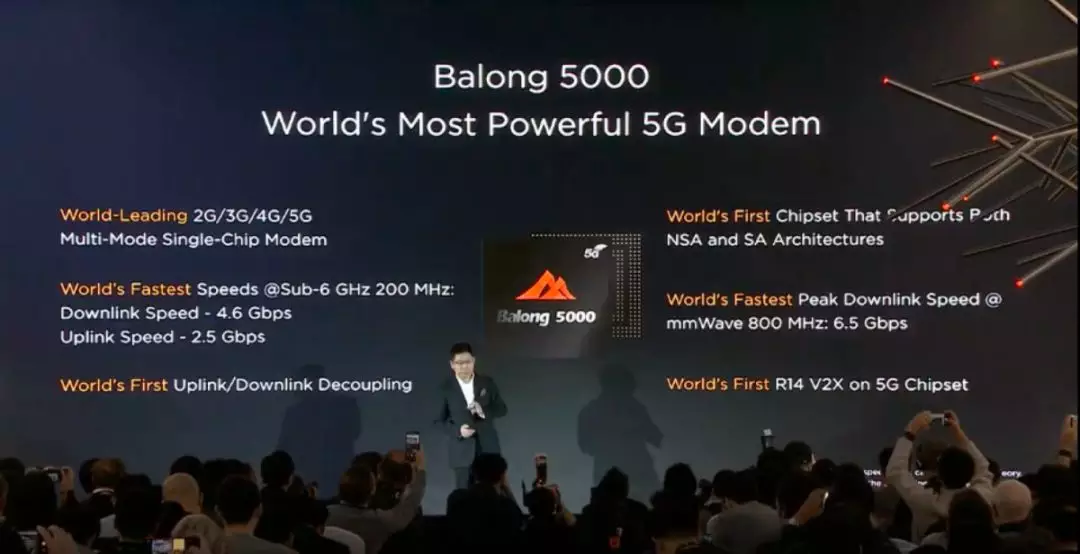 华为的Balong 5000,是一款单芯片多模的5G模组,能够在单芯片内实现2G、3G、4G和5G多种网络制式,有效降低多模间数据交换产生的时延和功耗。并且在全球范围内率先支持NSA和SA联合组网方式,支持FDD和TDD实现全频段使用。同时,实现业界标杆的5G峰值下载速率,在Sub-6GHz(低频频段,5G的主用频段)频段实现4.6Gbps,在毫米波频段达6.5Gbps,是4G LTE可体验速率的10倍。