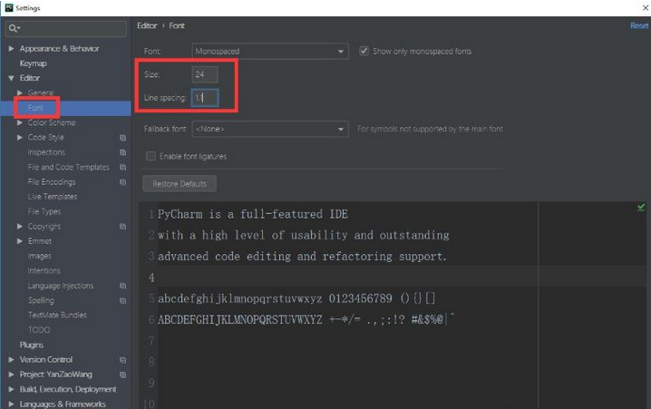 修改方法:进入PyCharm,File ==> setting==>Editor ==> Colors & Fonts ===> Font,右侧的Schema可以选择字体配置,这里推荐Monokai。下面的Primary font就是所用的具体字体,不过不可以直接修改。需要先点击上边右边的Sava As...,等于是把当前的字体配置复制一个副本,然后在副本上修改。