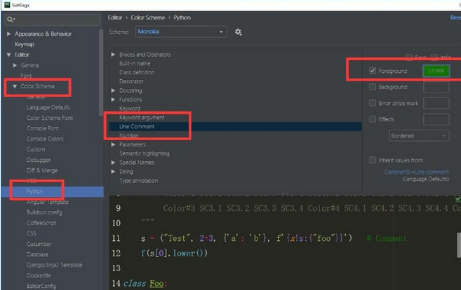 同样,通过修改“keyword argument”的颜色可以把关键字参数的颜色改掉。