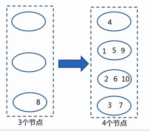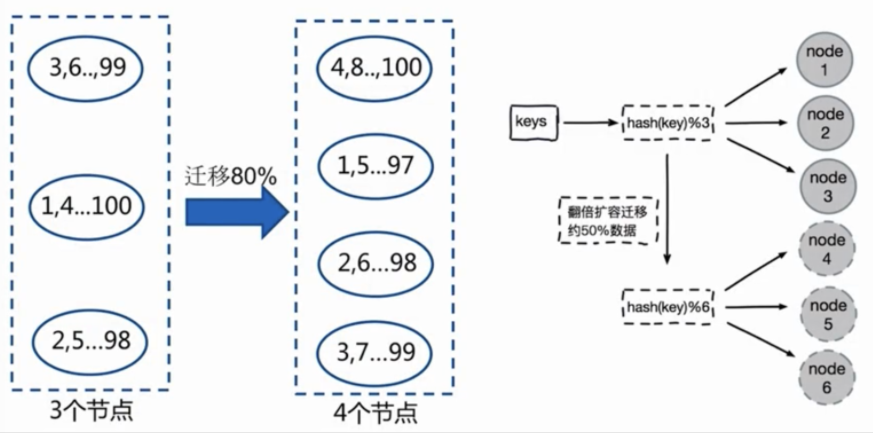 节点伸缩:数据节点关系变化,导致数据迁移。迁移数量和添加节点数量有关:建议翻倍扩容。