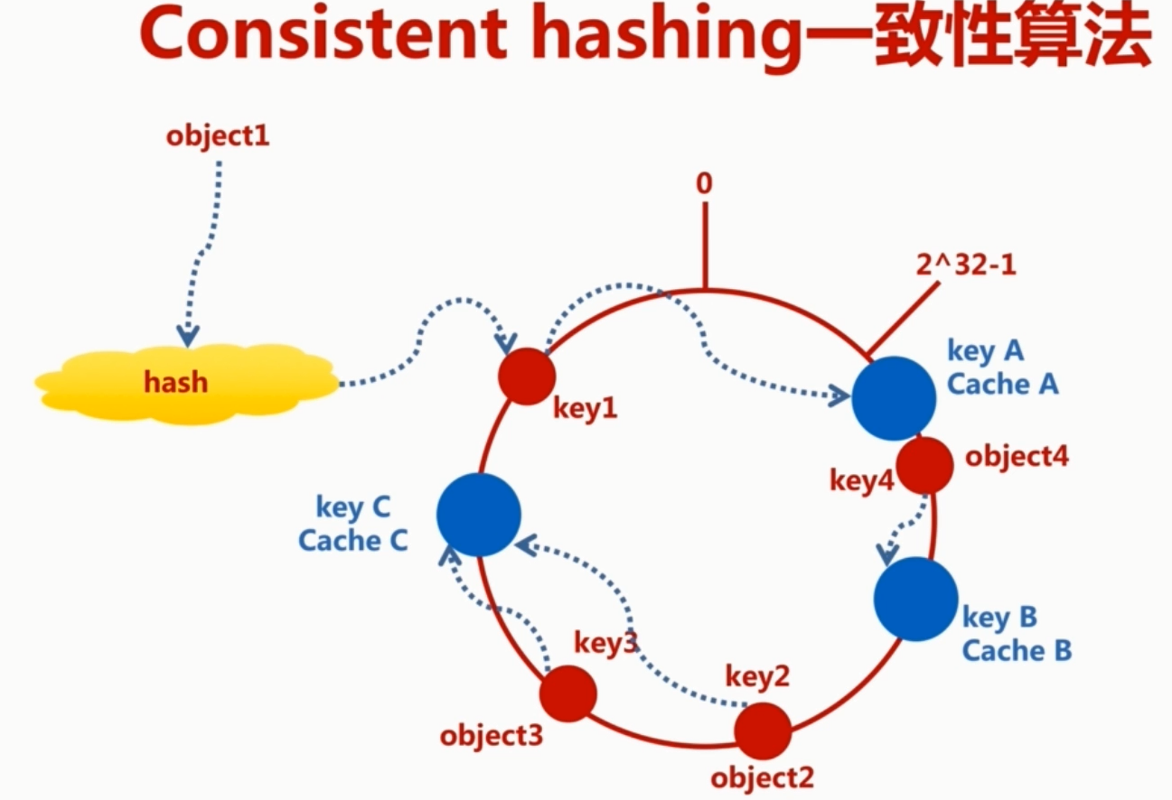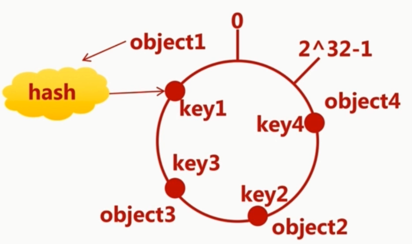 按常用 hash 算法,将对应的 key hash到一个具有2^32个桶的空间,即(0 ~2^32- 1)的数字空间中,现在我们将这些数字头尾相连,想象成一个闭合的环形: -