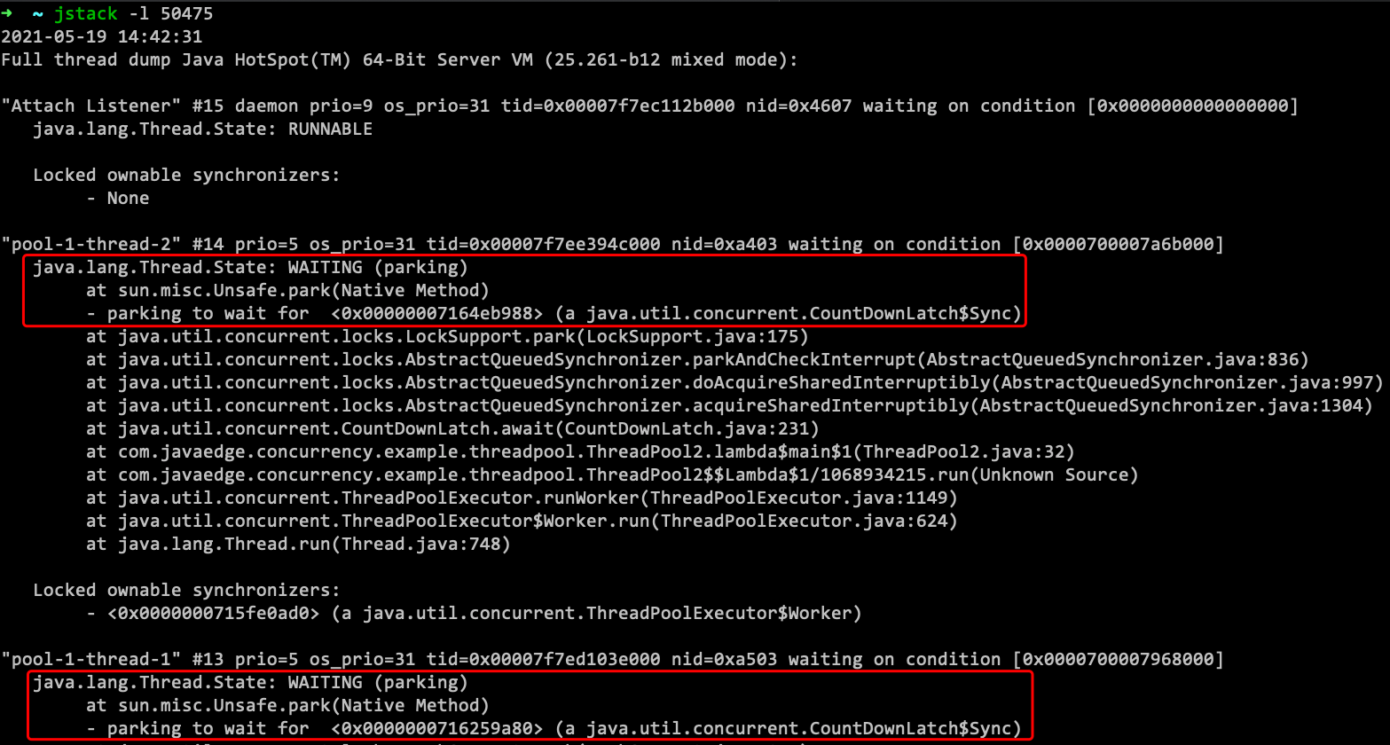 - 每个线程下面都会输出当前状态,以及这个线程当前持有锁以及等待锁,当持有与等待造成循环等待时,将导致死锁
