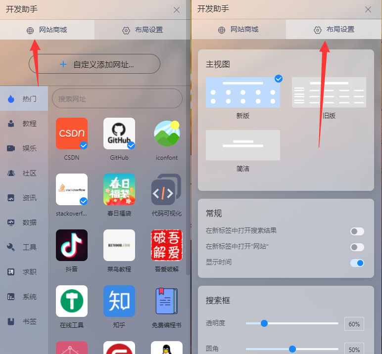 在开发助手模块里面我们可以设置常使用的站点到页面中,也可以对布局样式按照自己喜好做调整