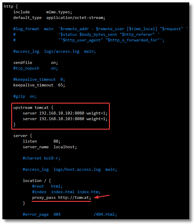然后在 server 节点的 80 端口下添加下图中的内容。默认情况下,Nginx 是按加权轮询的方式将请求分发到各个服务器,当权重 weight 不指定时,各服务器 weight 相同。关于 Nginx 启动用户的问题请根据自身实际环境进行配置。