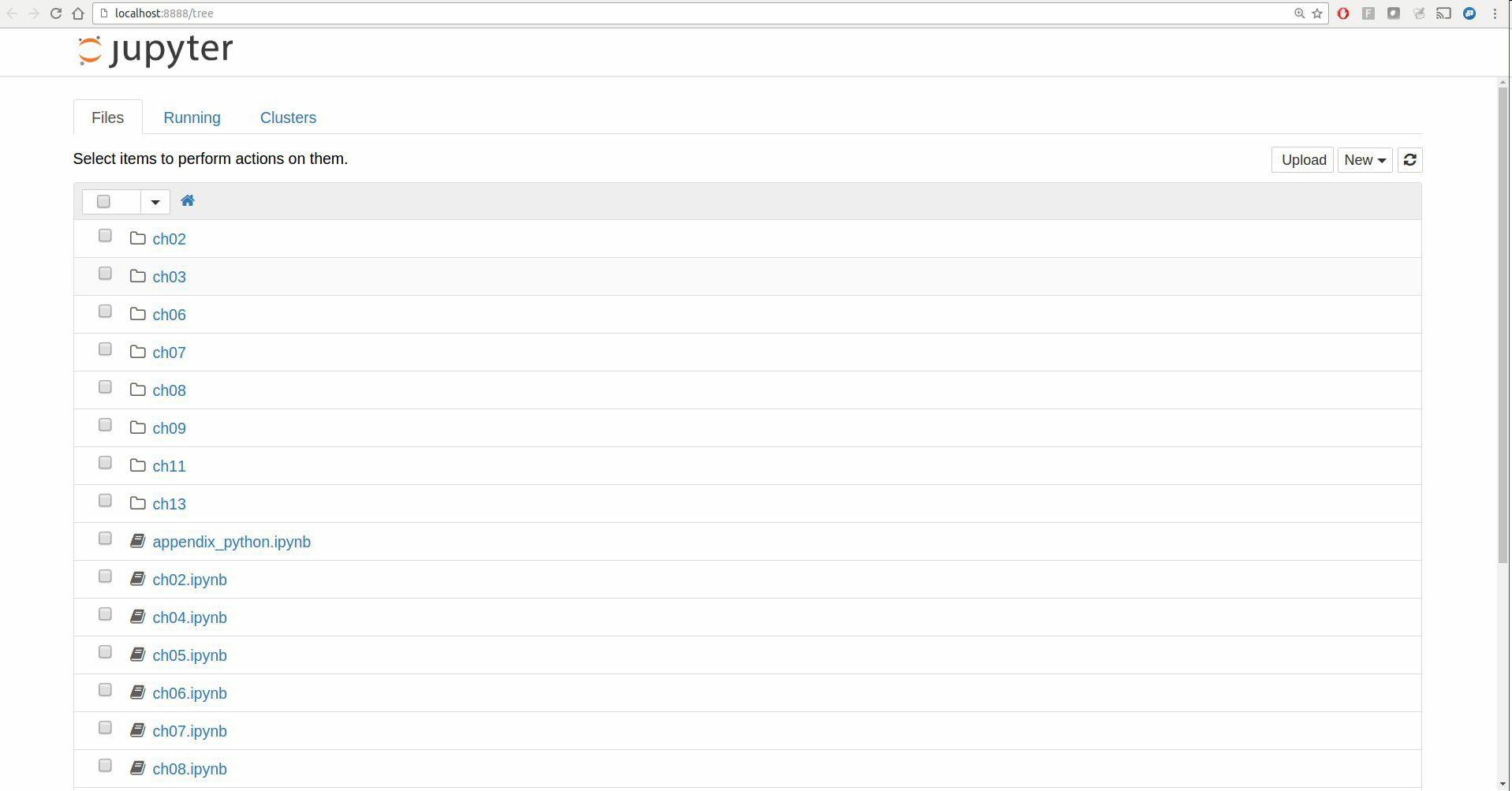 当保存notebook时(File目录下的Save and Checkpoint),会创建一个后缀名为.ipynb的文件。这是一个自包含文件格式,包含当前笔记本中的所有内容(包括所有已评估的代码输出)。可以被其它Jupyter用户加载和编辑。要加载存在的notebook,把它放到启动notebook进程的相同目录内。你可以用本书的示例代码练习,见图2-3。