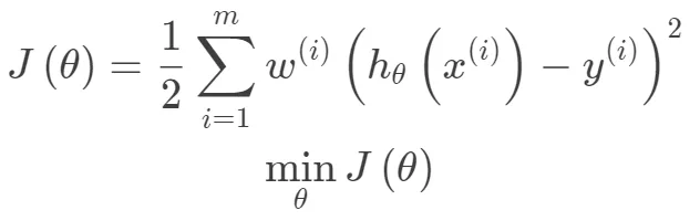 局部加权线性回归,在线性回归基础上引入权重,其目标函数(下面的目标函数是针对一个预测样本的)如下: