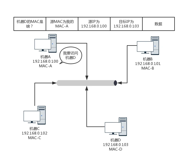 MAC,Medium Access Control,媒体访问控制。就是控制在往媒体上发数据时,谁先发、谁后发。这个规则称为多路访问。比如如下方案:
