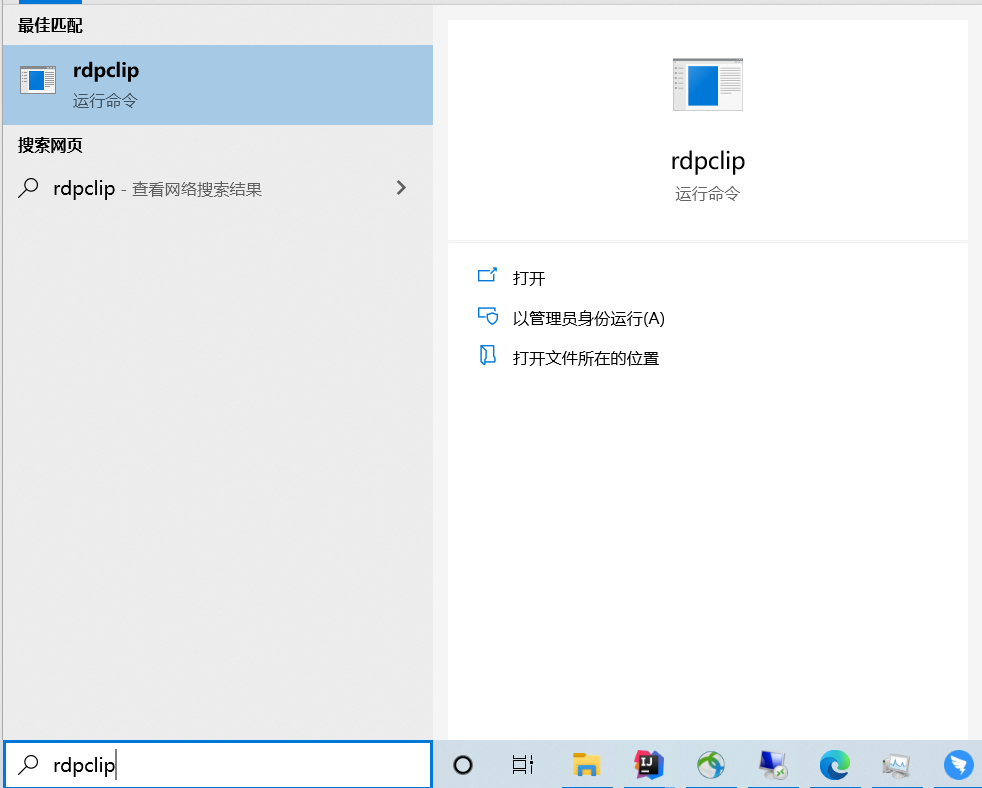 二、在服务器的开始菜单找到搜索,在运行框内输入”rdpclip“然后会显示这个进程出来,直接回车,赶紧在试试是否能传输文件了。